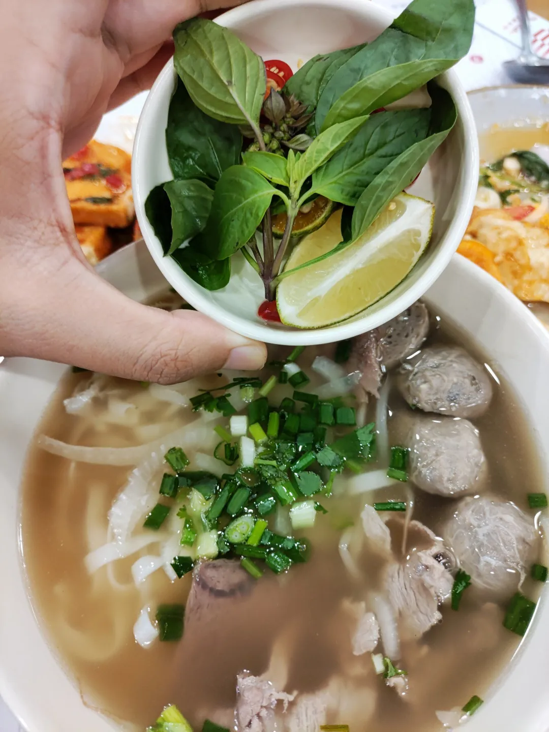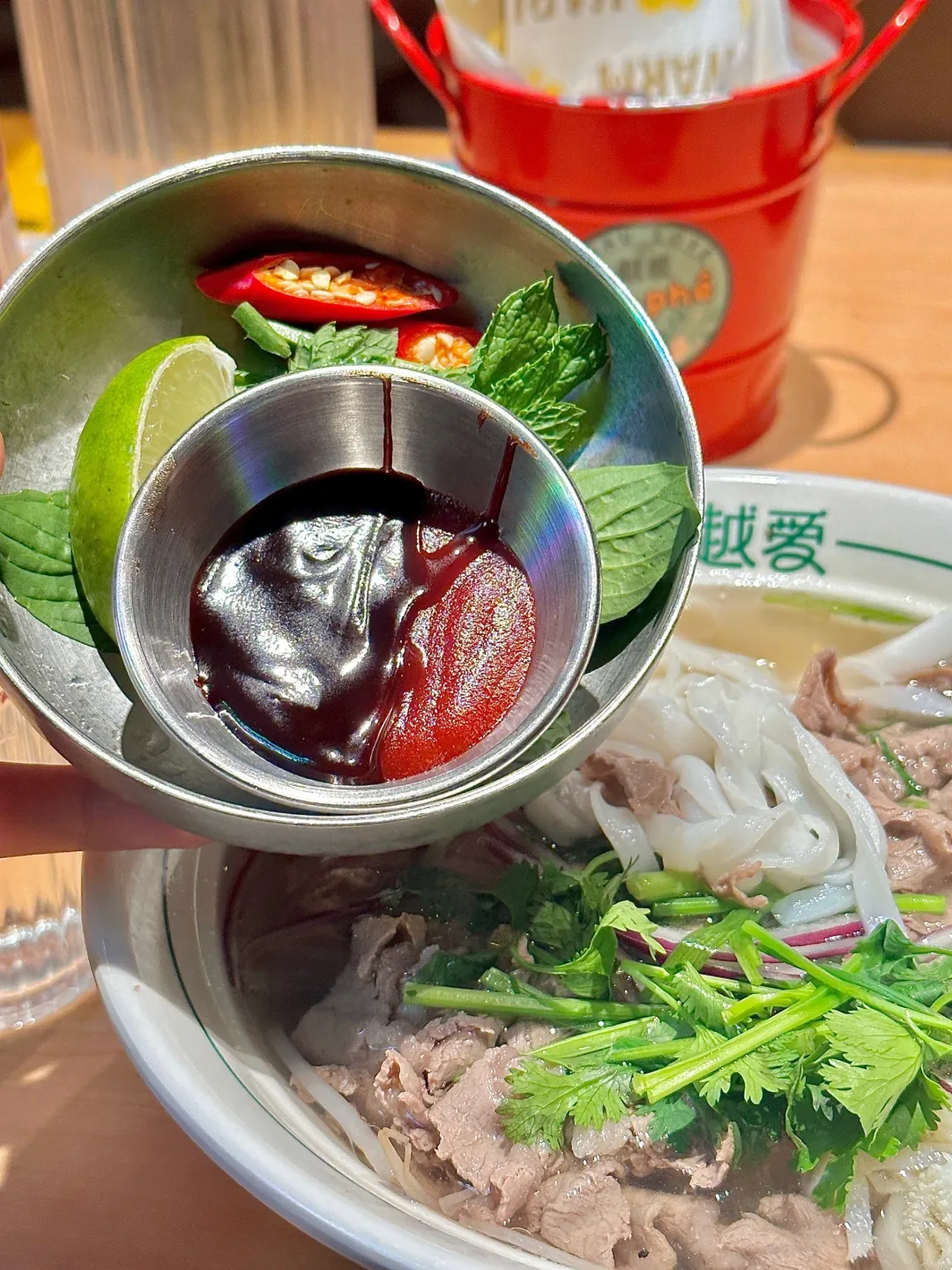 而且它的搭配特别灵活,不挑口味、不挑饮食偏好。爱吃肉的,有牛肉片、鸡肉片;爱吃素的,多加豆芽、罗勒就很满足;能吃辣的,加勺小米椒、淋点辣椒酱;不能吃辣的,只放青柠汁,清爽又解腻。不像有些美食,比如臭豆腐、榴莲,爱的人爱死,恨的人躲着走,越南河粉就没有这个问题,包容性极强,男女老少、各个国家的人,吃第一口基本都不会排斥。