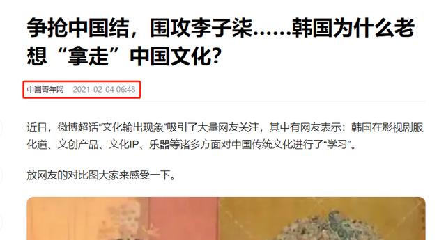 信息来源:中国青年网2021年2月4日关于“争抢中国结,围攻李子柒……韩国为什么老想“拿走”中国文化?”的报道