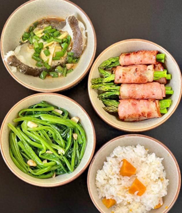清蒸比目鱼+培根芦笋+蒜蓉菠菜+南瓜饭+黑咖啡力优纤