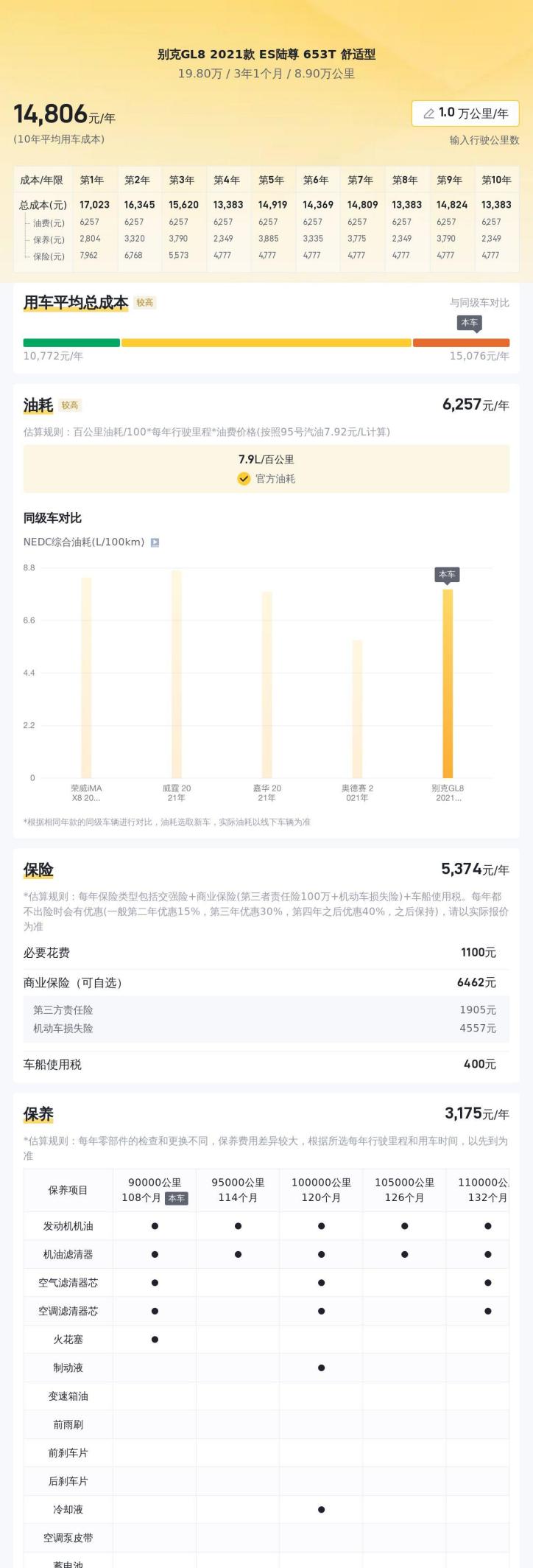 其次,要考虑用车成本。根据一些汽车网站的统计数据,GL8的平均年均用车成本大约在1.5万-2万元之间,这其中包括燃油费、保养费、保险费、停车费等等。当然,具体的用车成本会因个人驾驶习惯、使用频率、所在地区等因素而有所不同。