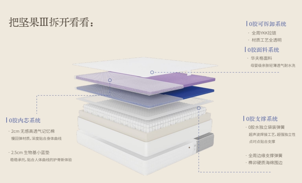 栖作坚果床垫在材质和工艺上可谓下足了功夫,采用了全床0胶水的环保设计,像千层饼一样独立叠加,所有做工和用料都可视可见,环保又健康,睡的也更安心!