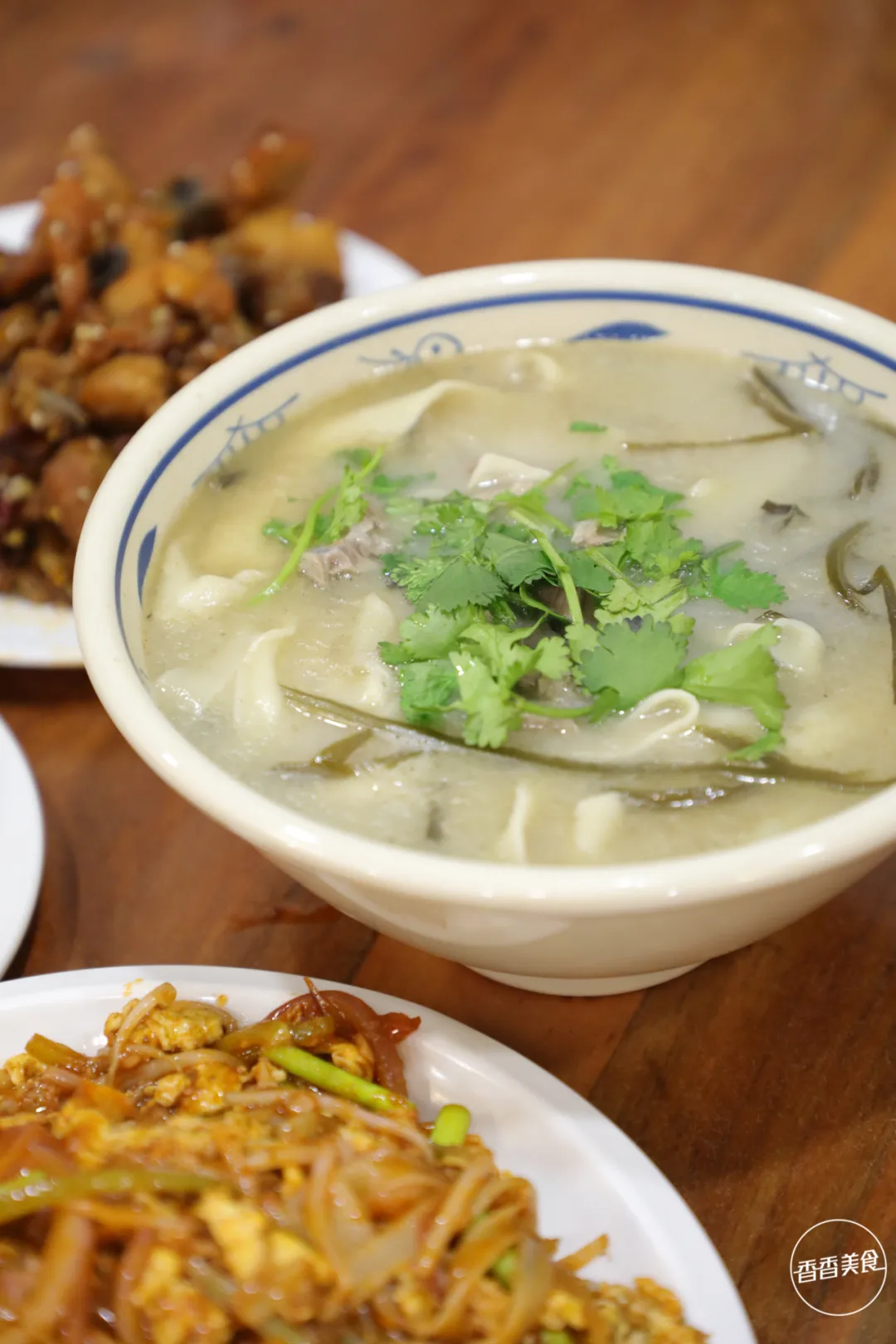 「老式烩面」一碗热气腾腾的老式烩面端上了桌,先来一口汤,滋味浓香不寡淡,也没有油腻感和羊膻味。和以往吃到的烩面比起来,这碗烩面要偏细一些,却不失筋道,嚼起来不仅有浓郁的面香,后味里还透着羊肉的鲜香。在海带丝和粉条的攻势下,味蕾对老味道的记忆,一下就被击中了。