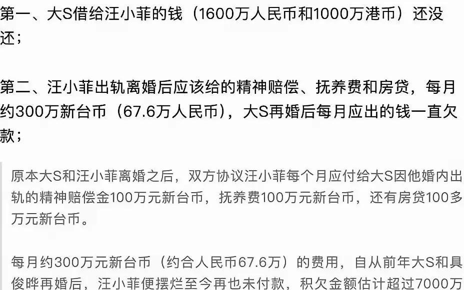 台湾媒体这两天报得沸沸扬扬,说是S妈这回要正式跟汪小菲撕破脸,张口就要2.5亿新台币。这钱到底怎么算出来的?咱们掰着指头数数:头一桩是大S当年借给汪小菲的1600万人民币加1000万港币,折成新台币差不多一个亿。第二笔更狠,说是这些年积压的精神损失费、孩子抚养费还有房贷啥的,每个月得交300万新台币。自打大S跟具俊晔结婚后,汪小菲就断了这些钱,七算八算又欠出7000万。这账目还是大S在世时法院判的数目,现在利滚利涨到了2.5亿,听着就跟滚雪球似的。
