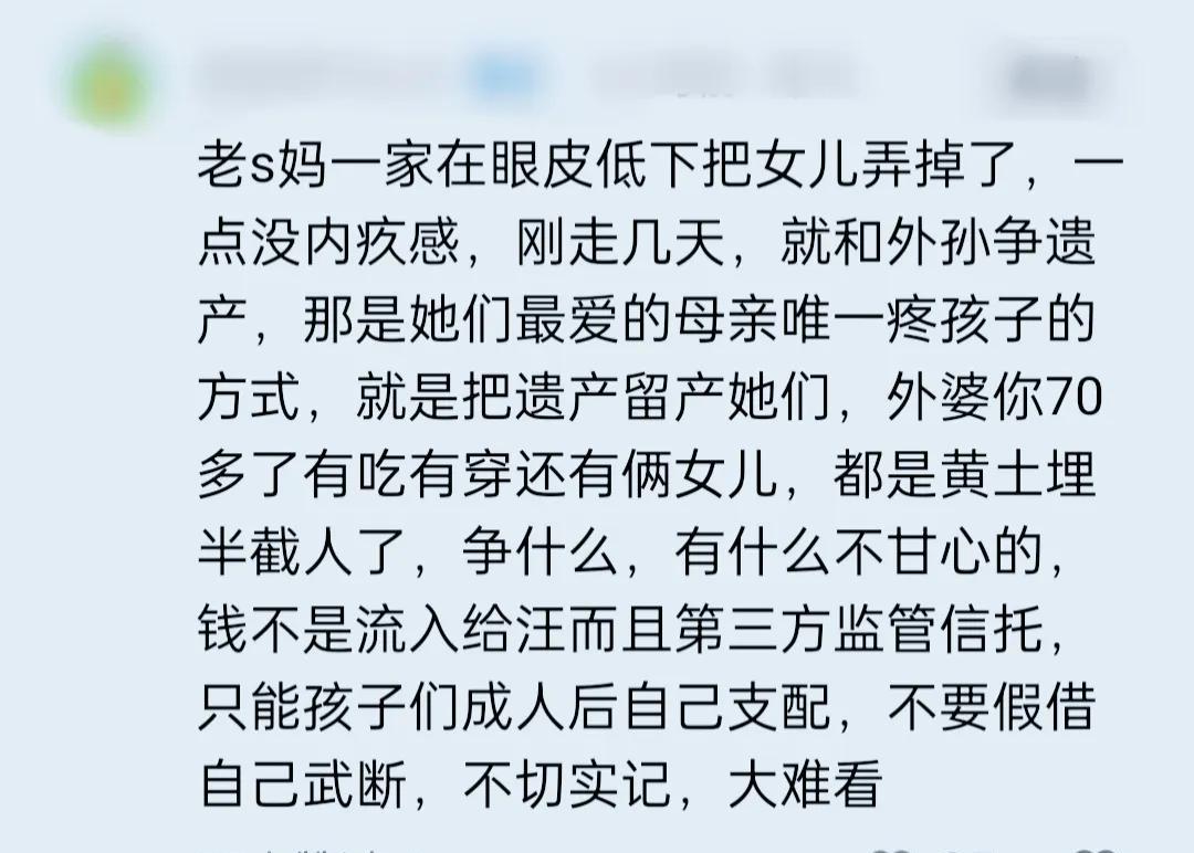 网友们这会儿都炸开锅了。有人说大S糊涂,活着的时候光跟妹妹聊后事,正经遗嘱一个字没写,现在倒好,留下俩娃跟着遭罪。还有人劝S妈想开点:“闺女都没了,争来的钱给谁花?您老都七十多了,拿着钱能带进棺材咋的?最后还不是得留给外孙,可外孙他爹不就是汪小菲嘛!”这话糙理不糙,老太太折腾来折腾去,搞不好最后钱又绕回老汪家。