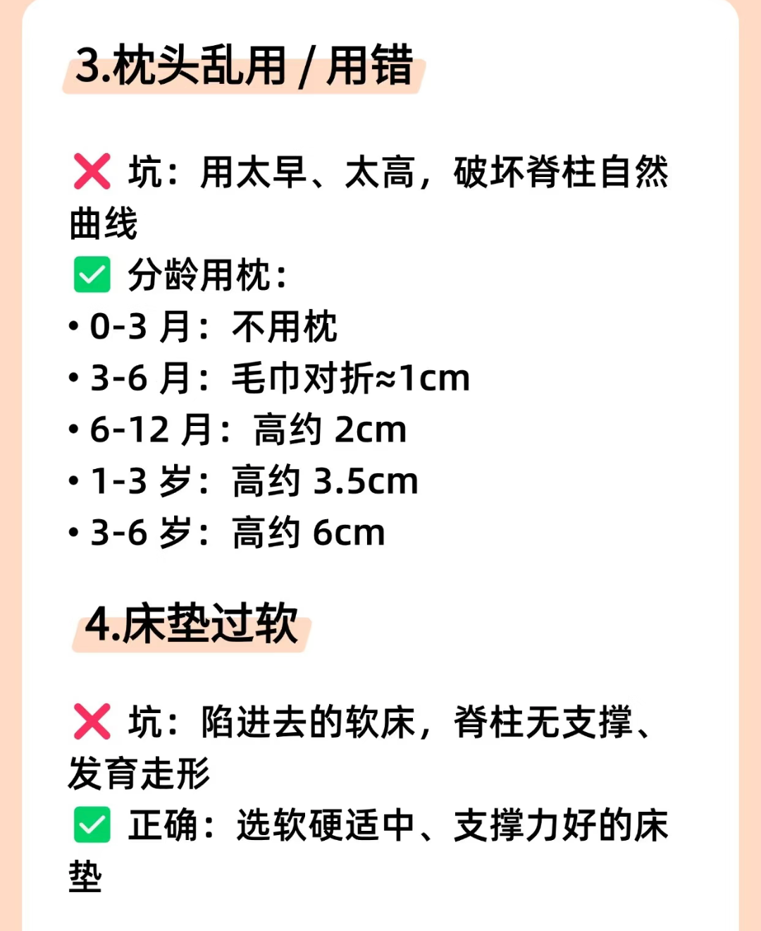 最后一个,是过早使用枕头。有些妈妈为了给宝宝睡头型,早早地就给用上了定型枕。可小月龄的宝宝脊柱是直的,根本不需要枕头,强行垫高,会让他的颈椎处于弯曲状态,影响呼吸和脊柱发育。起码等到一岁以后,再看情况用。