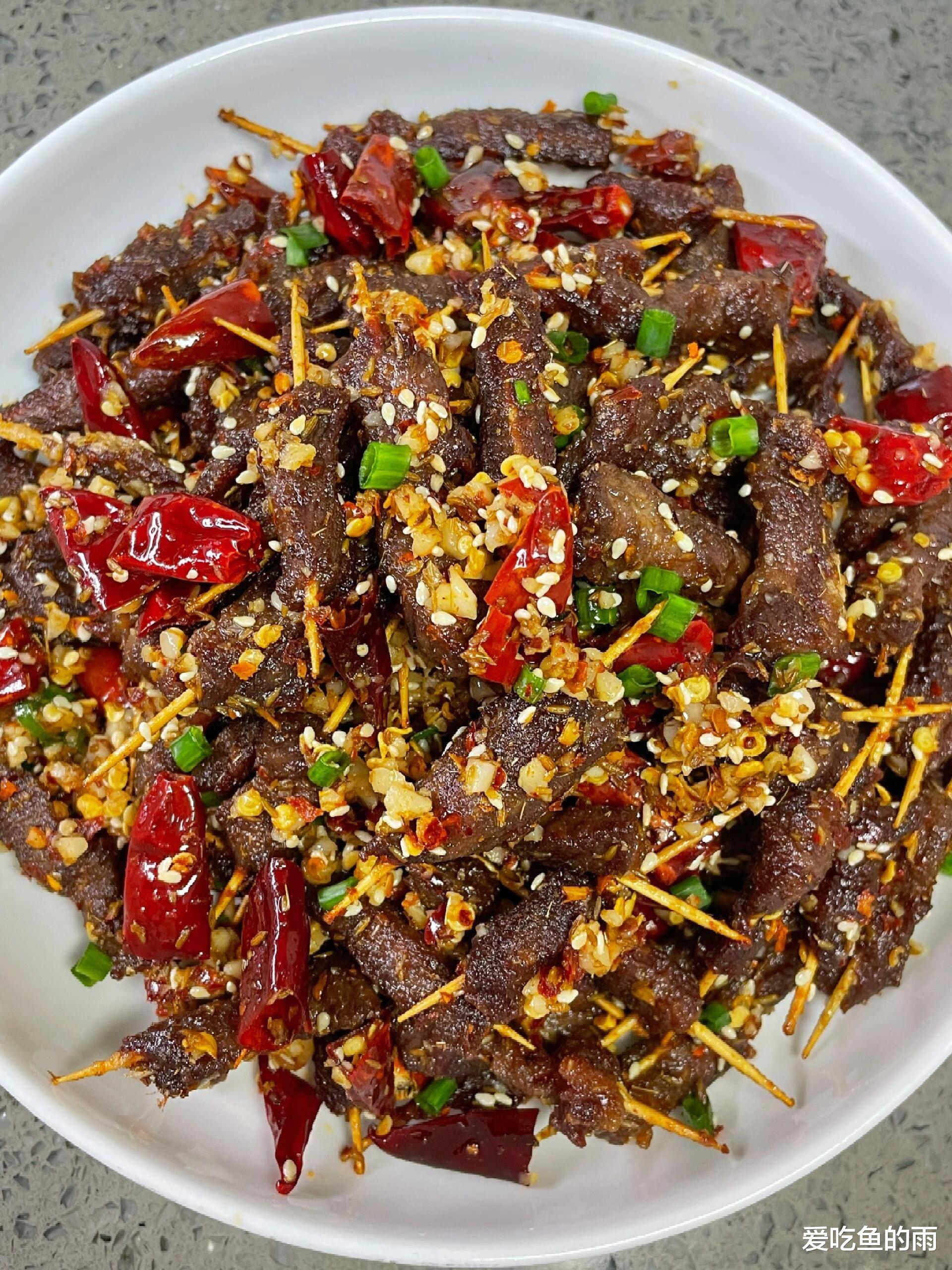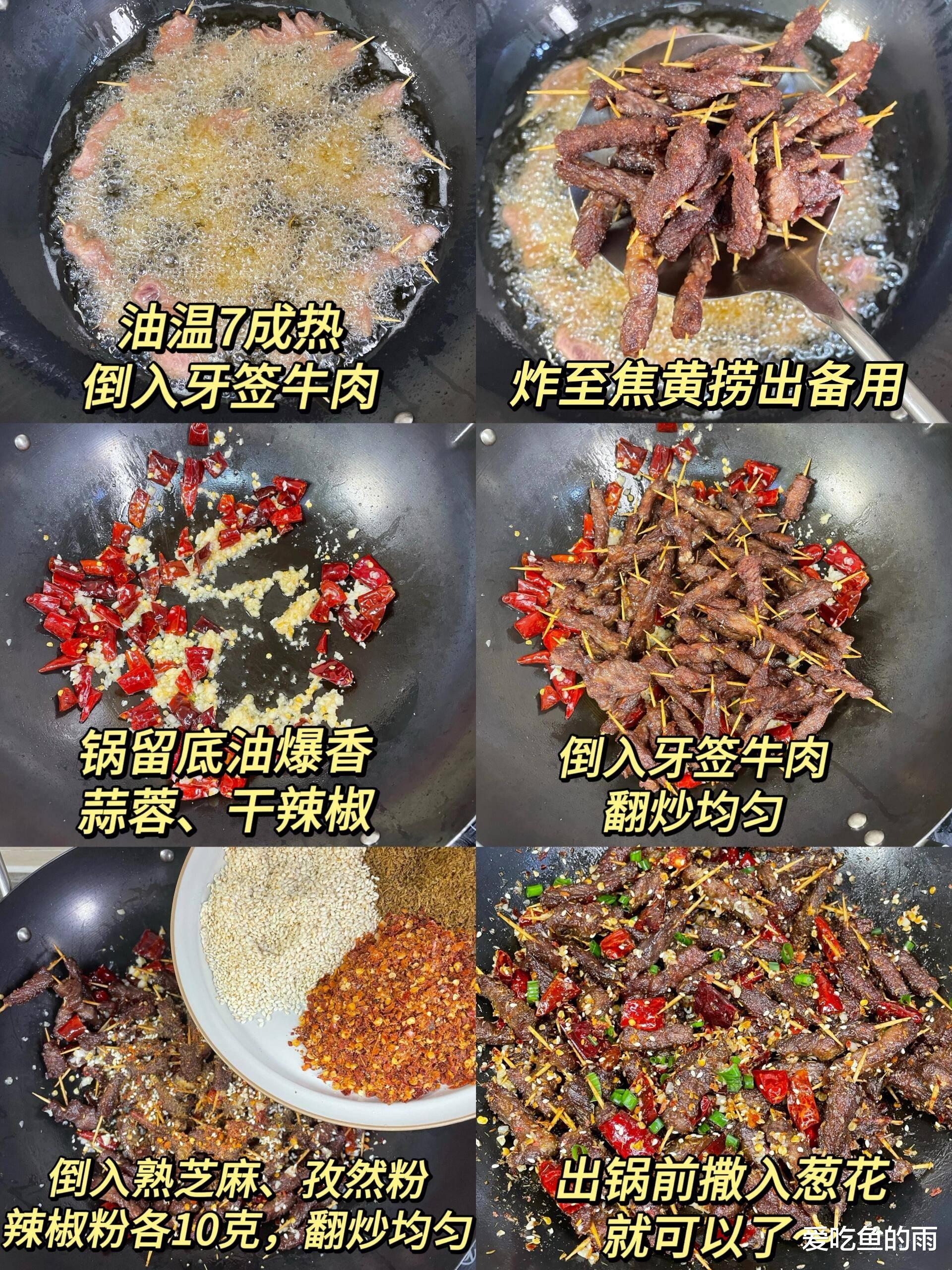 这盘金光闪闪的牙签牛肉,背后可藏着一段热闹的江湖故事呢。它本是湖南、四川等地夜宵摊上的“霸主”,是师傅们在大火猛灶前,为深夜食客快速烹制出的解馋美味。那浓烈的香气,能飘满整条街。后来,这份带着江湖烟火气的快乐,飞入了寻常百姓家,成了家庭聚会、朋友小酌时最受欢迎的快手菜。它不讲究摆盘,却最讲究真情实意;它登不了国宴厅堂,却牢牢占据着我们家餐桌的C位。