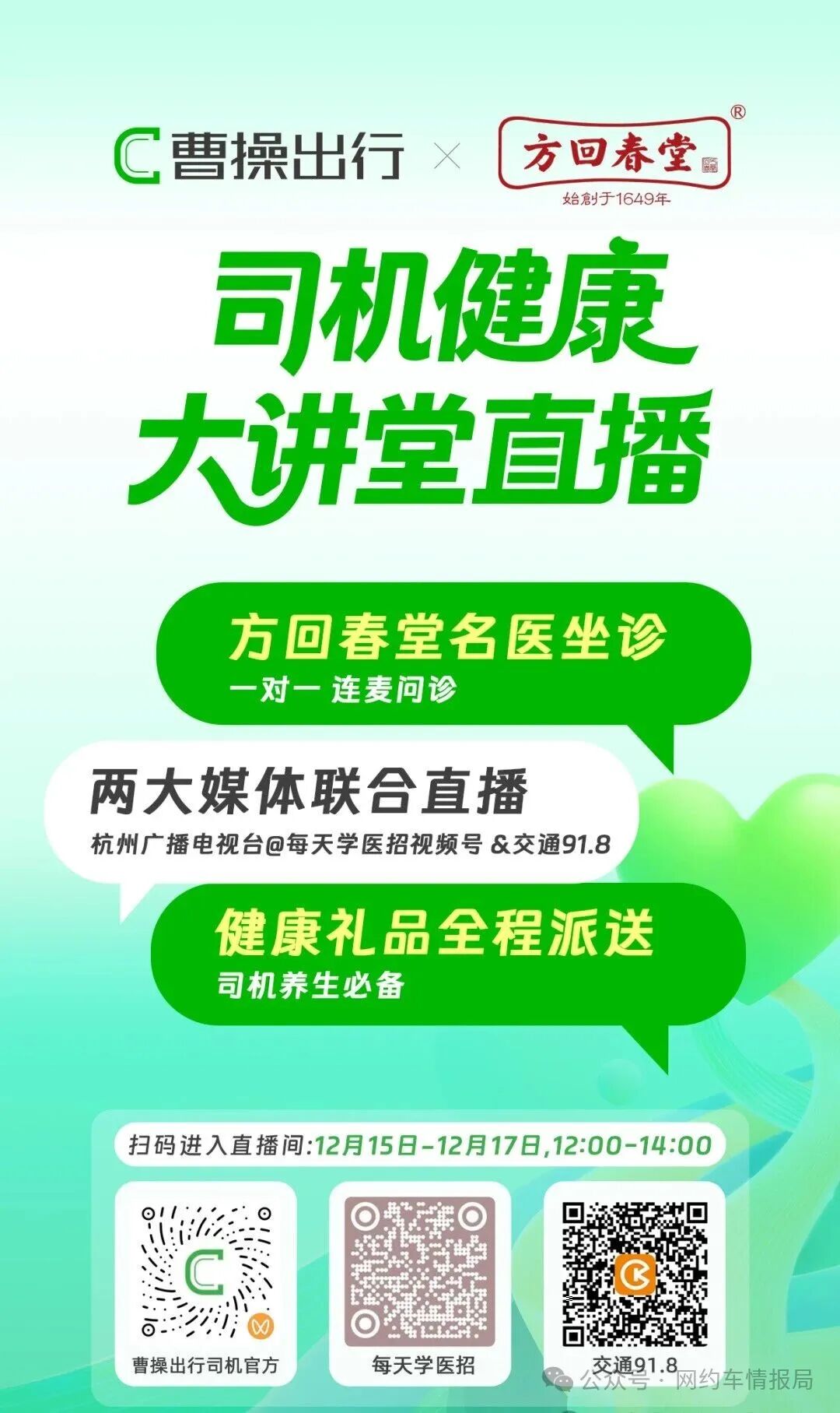 公益问诊即将开启,不能参加线下问诊的司机师傅们,记得预约曹操出行司机官方视频号12月15-17号12点或2点的线上直播问诊,永远都不要忘了,健康是1,其他都是0,只有身体健康了,其他才有意义。