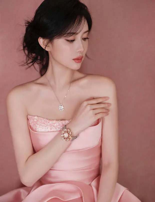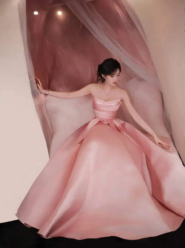 粉色抹胸长裙:2025年的一次活动中,她身穿“玫瑰石英粉”抹胸长裙,缎面材质泛着珍珠光泽,裙摆层叠褶皱如涟漪,展现出天鹅颈和直角肩的完美线条。