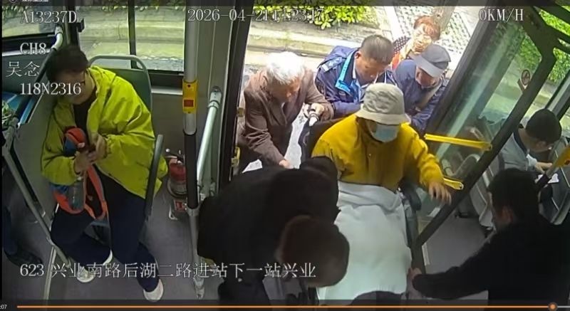 4月21日,623路司机和乘客帮助老人上车。通讯员供图