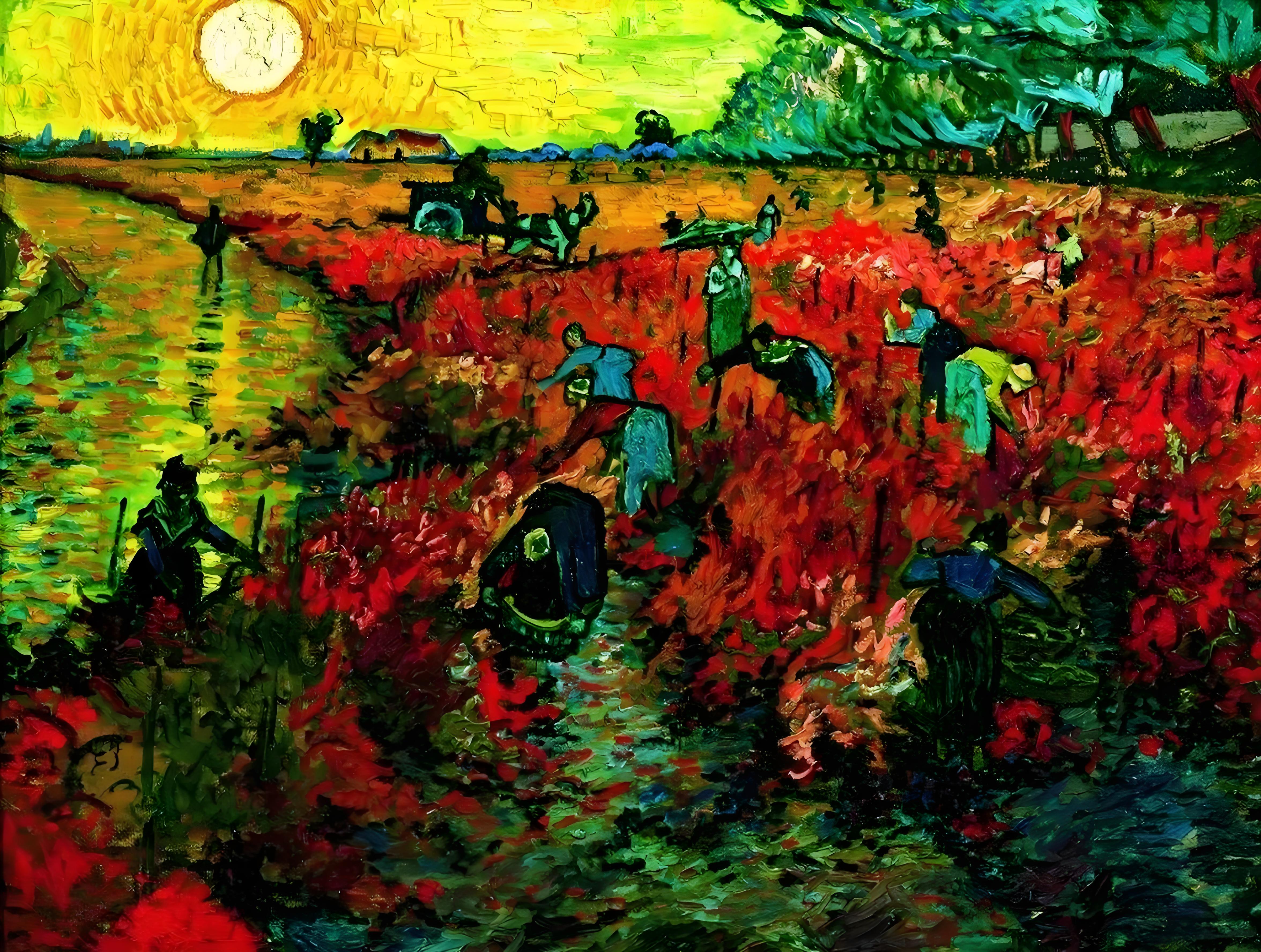 安娜后来回忆:"我一进画室就被《红色葡萄园》吸引了。那片葡萄园红得像着了火,夕阳把土地染成金红色,连空气里都飘着葡萄熟透的甜香。梵高站在画前,手一直在抖,他说:'这是我画过最累的一幅,太阳落山前我得赶工,不然光线就没了。'"