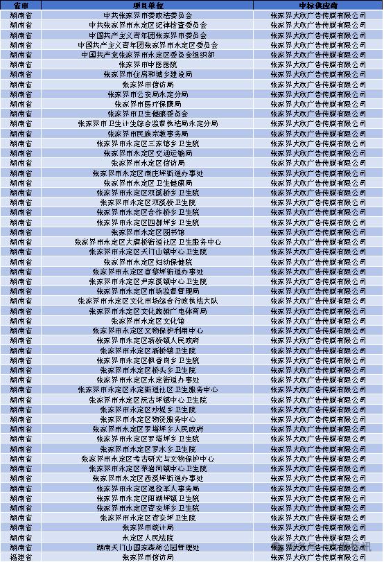 从2024年统计出全国供应商及其所在中标的省份和项目单位,以湖南省张家界大欣广告传媒有限公司为例,选取其部分中标的省市项目单位,示例如下: