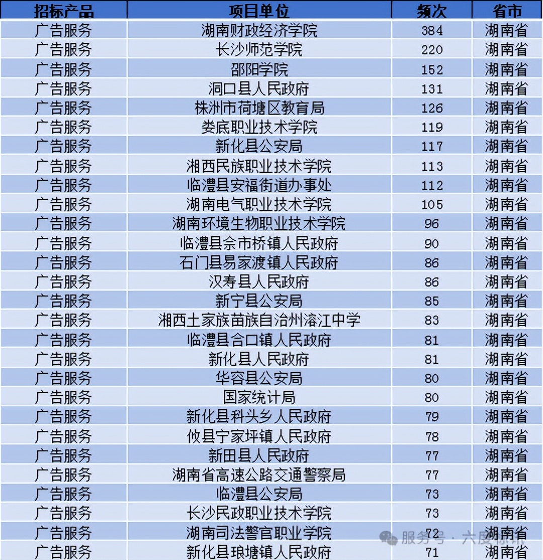 从2024年期间统计出各省招采项目单位约2.2万多条信息,以湖南省为例,现筛选出招标广告服务类产品部分高频次招标单位及其发标次数热度,如下所示: