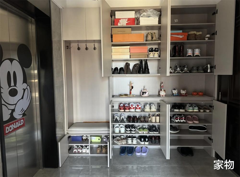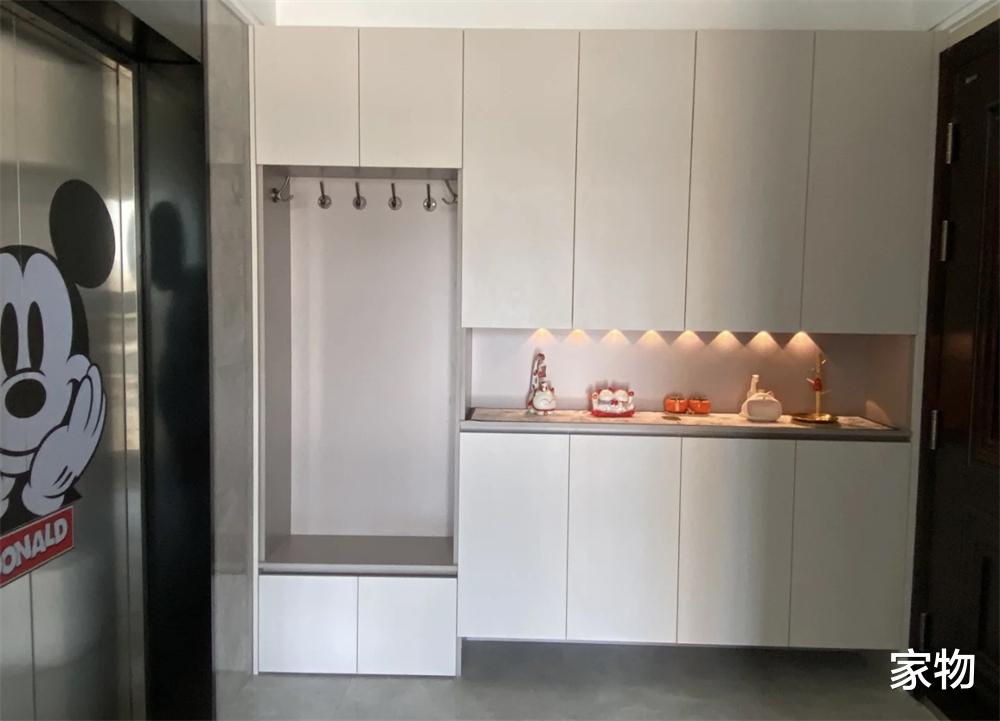 与此同时,旁边还有个简易的挂衣格和高处的吊柜收纳空间,以及预留的中间开放格(用来放装饰品和随手物品),整个电梯间显然变成了玄关入户区,不仅整洁有序,也方便收纳和拿取。