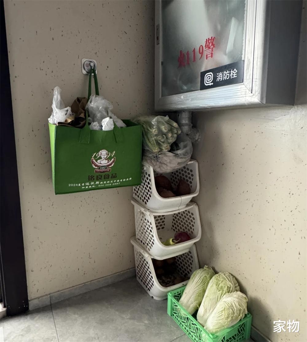 进门靠墙的边上,有一个固定的消防栓,无论如何装修,都不能遮挡或者改变位置,但在不影响应急使用的情况下,她却放上了几个蔬菜篮子,利用屋外温度较低的特点放蔬菜,也算是东北家庭的一个习惯了。