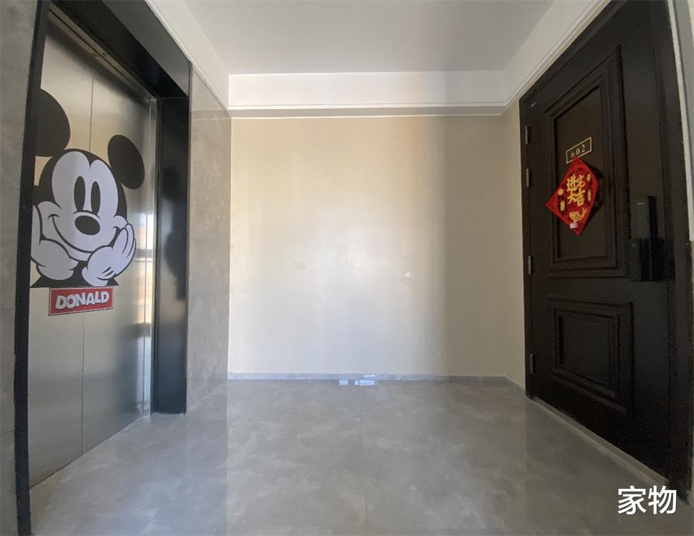 从电梯上来,整个空间贴砖刷墙已经布置完成,这位姑娘也只是在电梯门和旁边的应急通道门上贴了米奇的卡通贴纸,并没有做太多其他改动。