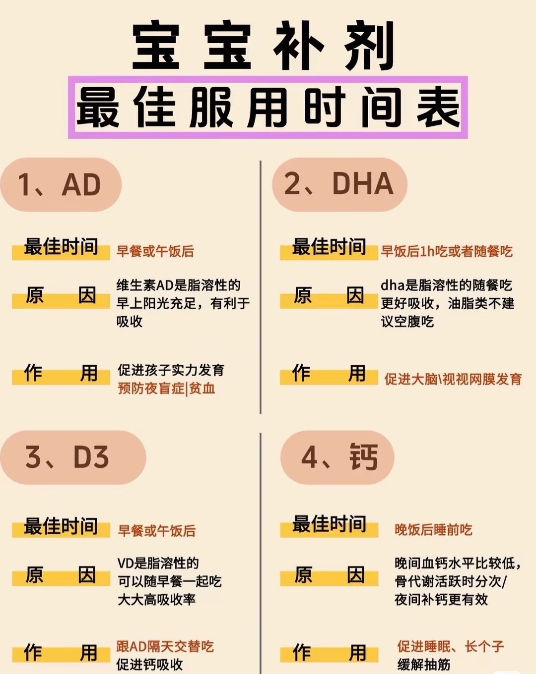 我之前也是个大迷糊,花了不少冤枉钱,直到带宝宝做儿保时专门请教了医生,才恍然大悟:原来补剂吃对了时间,效果真的会翻倍!