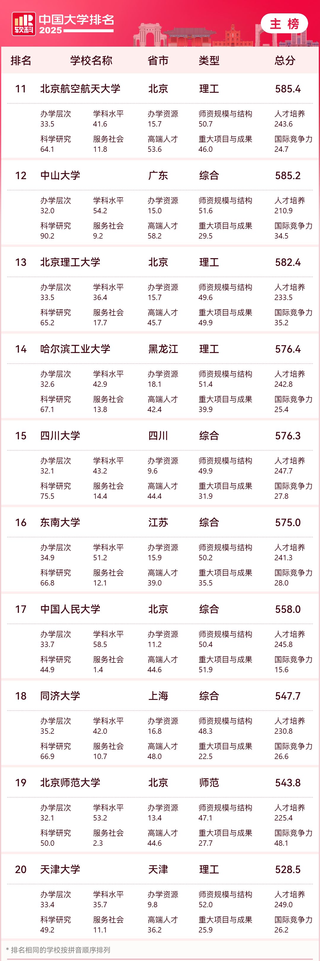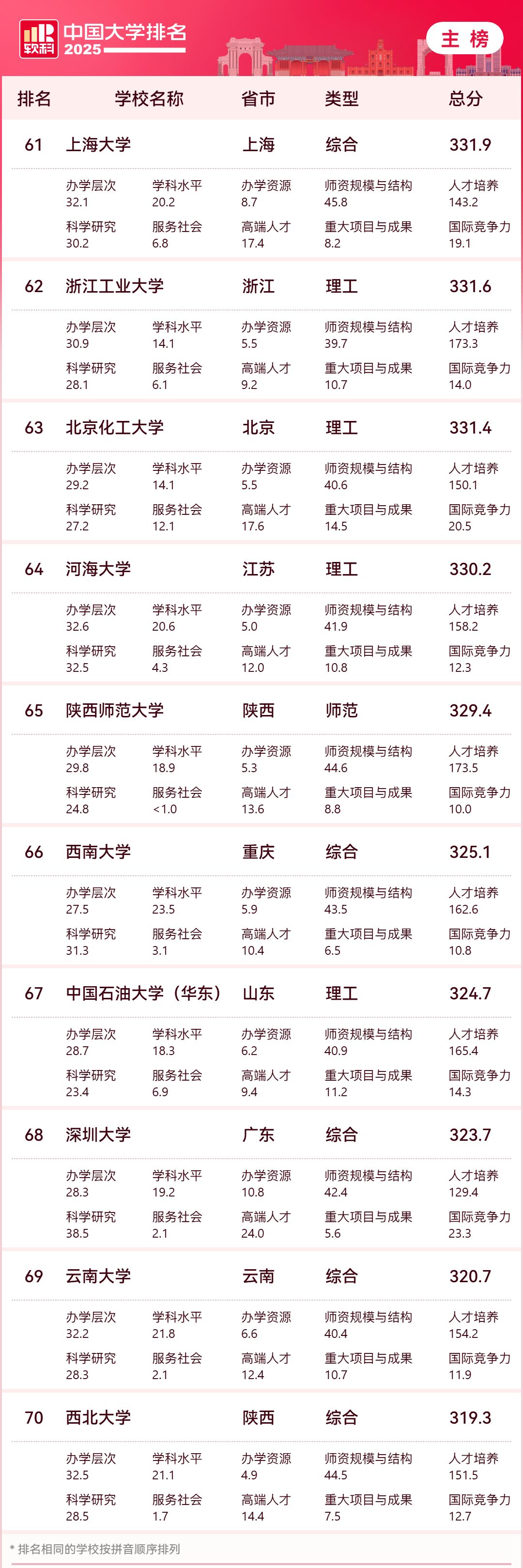2025软科中国大学排名的对象是中国1000多所本科层次的高校,榜单由综合性大学、8类单科性大学、4类非公办大学组成,采用差异化的指标体系分别排名。