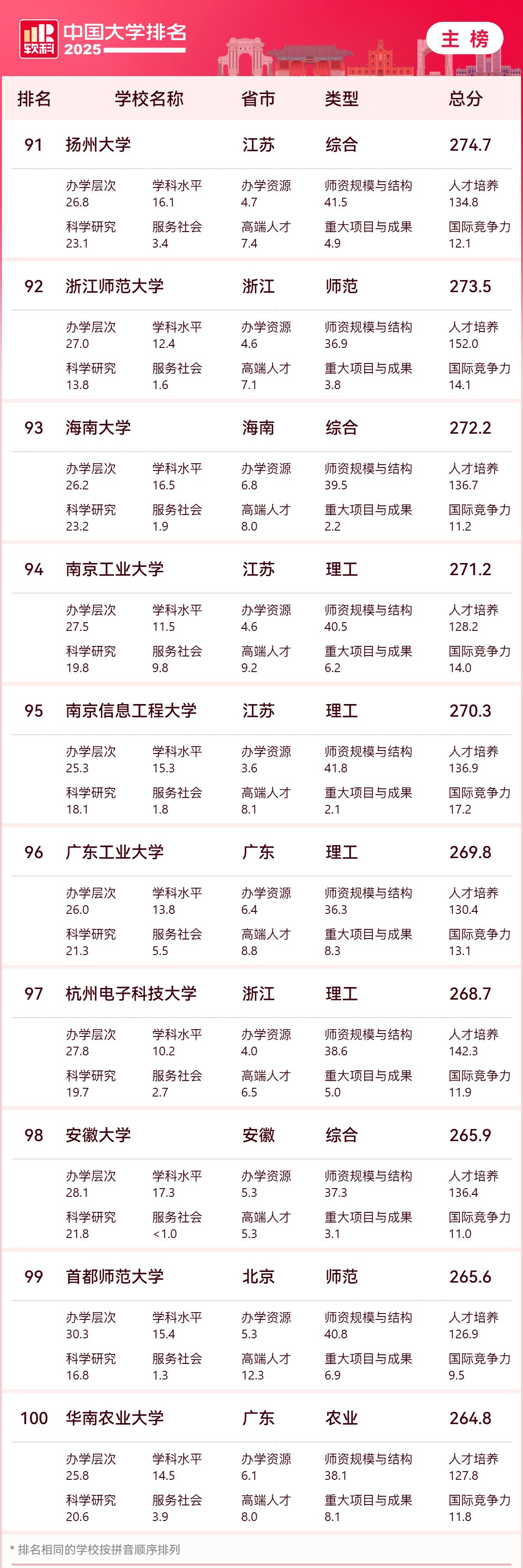 这91所高校中,有一所大学是今年新晋黑马:海南大学较2024年上升11名,位列全国第93名。至此,“双一流”高校在百强榜单中再增1所。