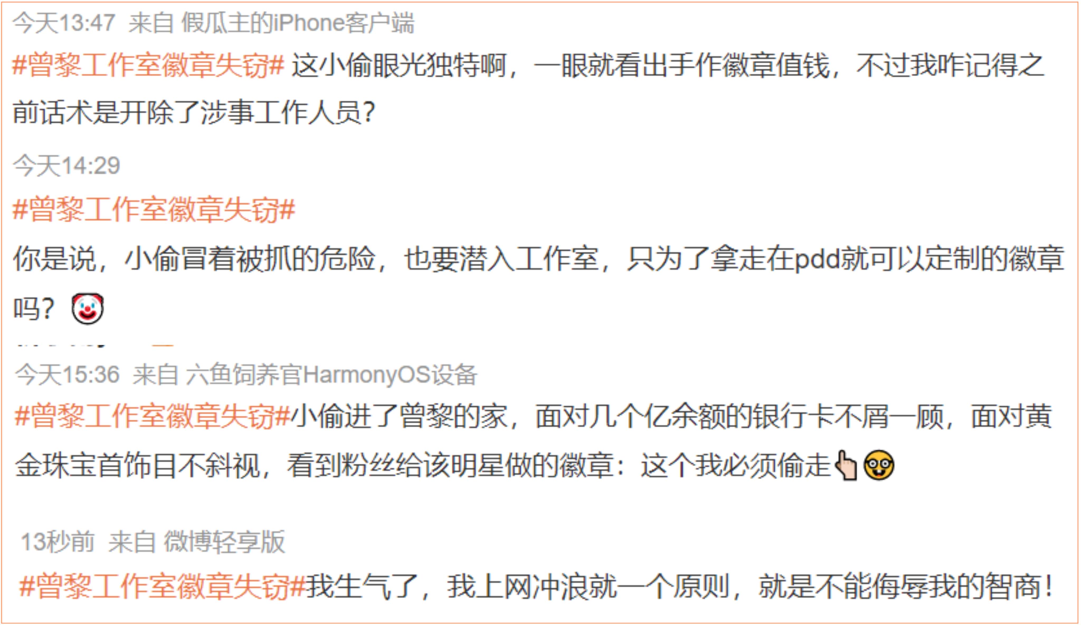 如今“曾黎工作室徽章失窃”的热搜,将这场闹剧推向更荒诞的境地。