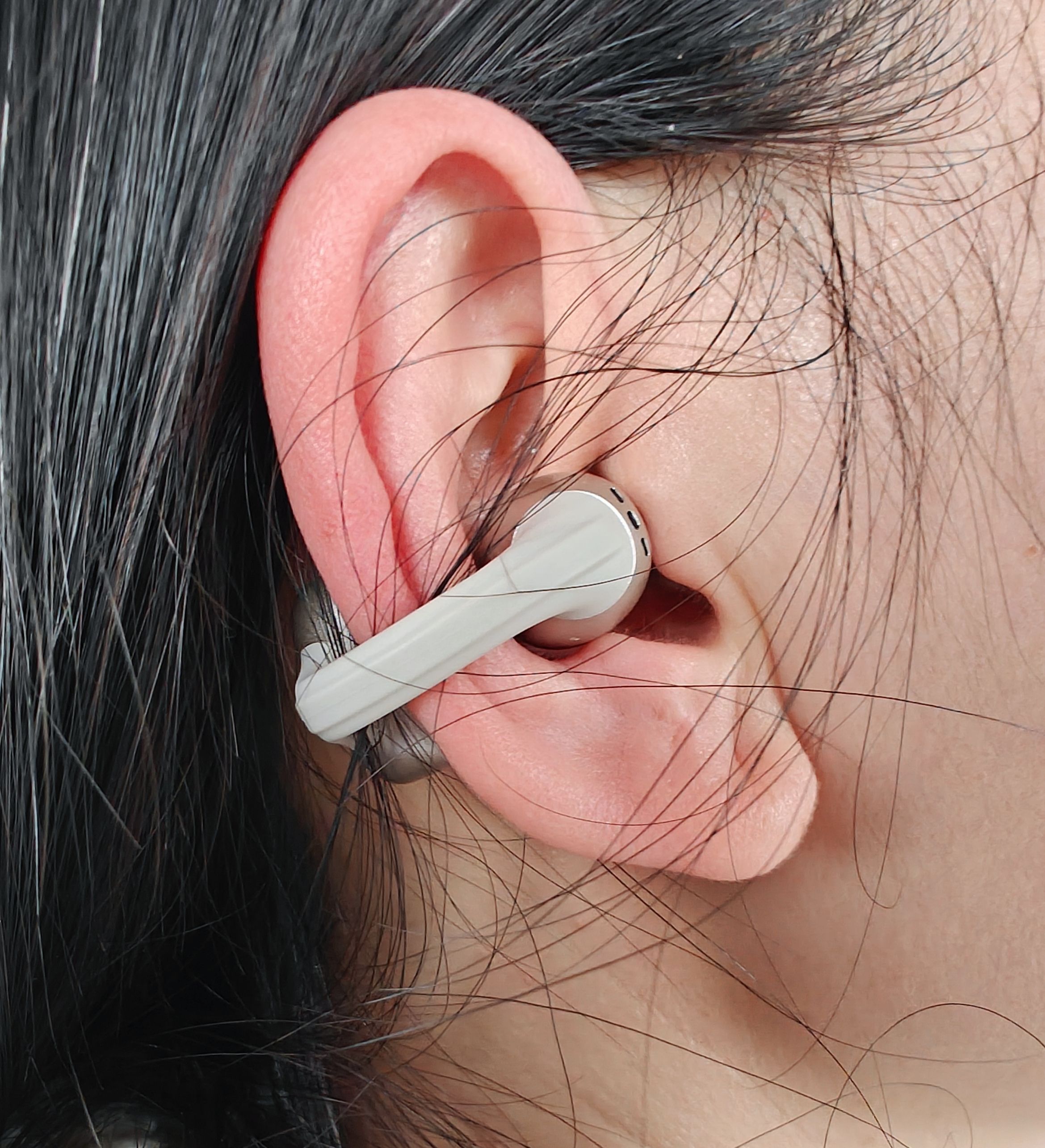 再看看耳机主体,球体 + 柱体环接式设计,特别有创意。扬声器和降噪都集成在球体部分,降噪麦、触控、电源在柱状体部分,这人体工程学原理运用得相当巧妙,戴在耳朵上稳稳当当,就像“锁”住了一样,不管我怎么骑车颠簸,都不用担心它会掉。