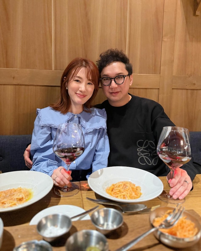 蒋家旻这次分享的照片里,最让人感到意外和高兴的是那难得一见的夫妻合影。在这张照片里,她身穿一件蓝底娃娃领的衬衫,显得青春洋溢,而站在她旁边的周永基则穿着一件黑色卫衣,显得既成熟又稳重。他们站在餐桌前,头部紧紧相贴,周永基更是体贴地把手放在了蒋家旻的腰上,两人深情地相互凝视,满溢着爱意。从他们的神态中,一眼就能看出他们非常般配,让人看了不禁心生羡慕。