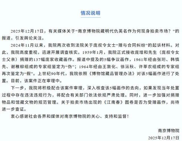艺术市场终究以真伪为价值基石。能拍出近亿价格的画作,其真伪在买受人群眼中已有公论。这自然引出一个尖锐问题:博物馆所称的“赝品”,与拍场上的“天价真迹”,是否为同一件物品?若为不同,那件从南京博物院“消失”的捐赠品,究竟流落何方?