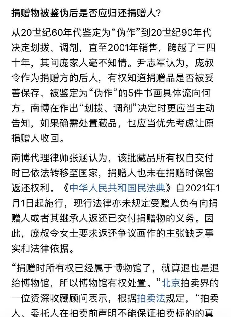 面对庞家后人多年追问与法院强制执行,南京博物院抛出“赝品”说法。这一回应非但未能澄清疑云,反而显得漏洞百出,颇有“被逼到墙角后慌乱抛出的挡箭牌”之嫌。