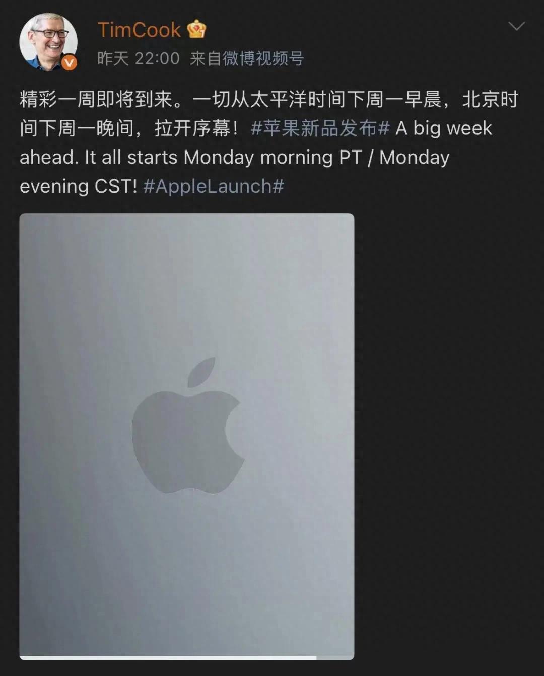 值得注意的是,库克此次官宣消息中还附带了一段视频,展示了在Mac产品机盖上的苹果Logo变化过程,预示着Mac新品即将到来。