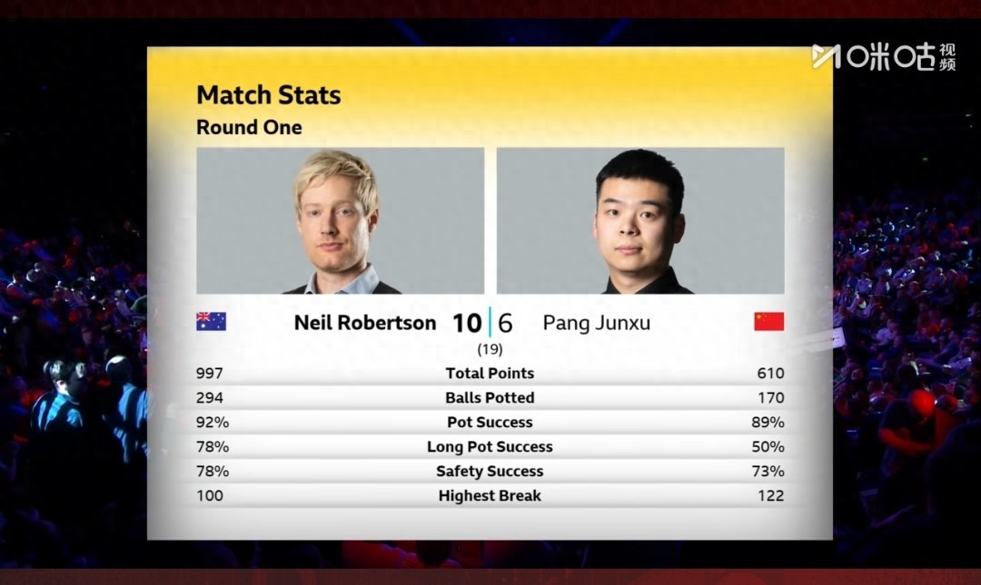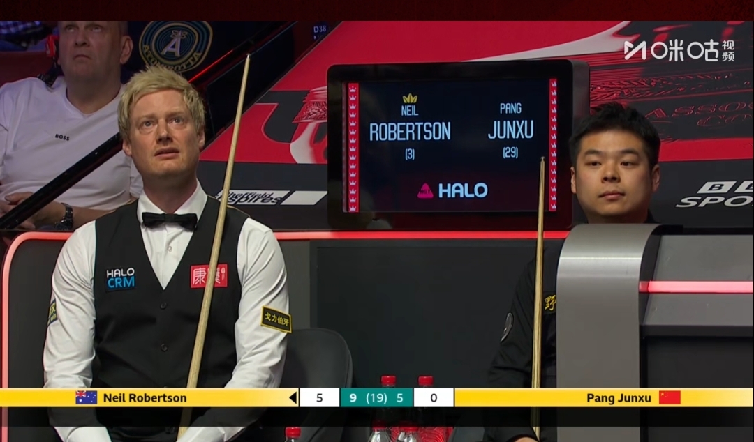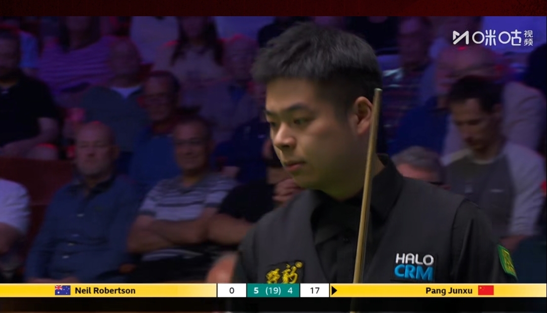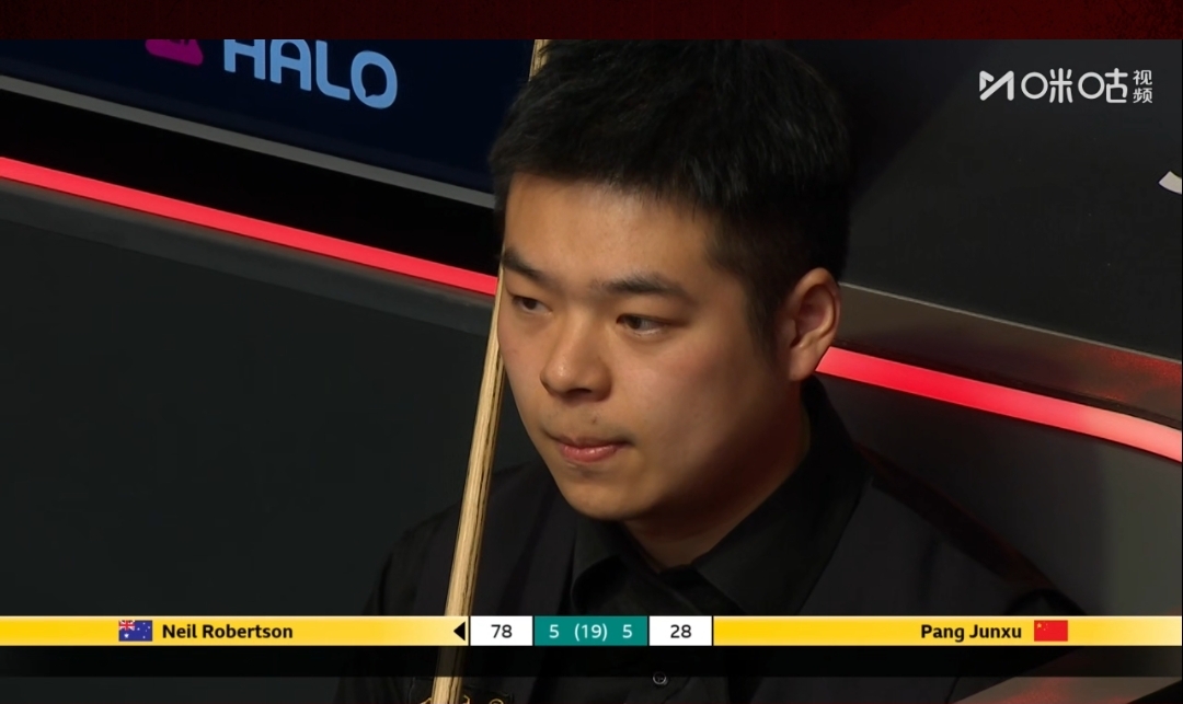 第一阶段比赛,罗伯逊58-47率先拿下第一局,第二局,庞俊旭打出单杆54扳回一局,第三局,罗伯逊打出单杆81总分127迅速拿下,随后庞俊旭连下两局取得3-2领先期间打出单杆73分表现,罗伯逊连下三局打出单杆72,53表现,第9局,庞俊旭轰出单杆破百122拿下,第一阶段庞俊旭仅仅落后一局4-5。双方在第一阶段打得旗鼓相当,比赛相当精彩!