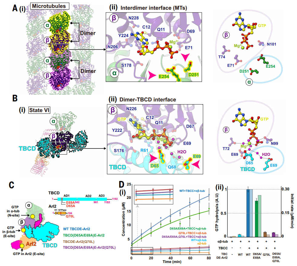 本研究通过高分辨率冷冻电镜结构解析,首次系统揭示了TBCs与Arl2在αβ-微管蛋白异二聚体组装与解聚过程中的分子机制:Arl2通过其GTP结合状态作为分子开关,驱动TBCs发生构象变化,从而实现“无GTP时解聚、有GTP时组装”的动态调控;Arl2与β-微管蛋白的协同GTP水解活性构成了严格的质量控制机制,确保微管蛋白稳态的精确调节。
