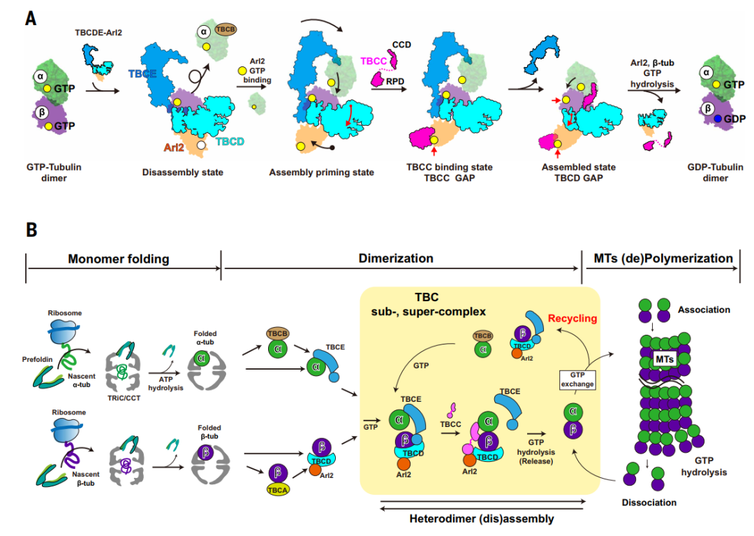 微管蛋白由 αβ-微管蛋白异二聚体构成,其组装与解聚过程依赖于一类称为微管蛋白结合辅助因子(TBCs)的伴侣蛋白,包括 TBCA、TBCB、TBCC、TBCD、TBCE;此外,小GTP酶Arl2也参与调控该过程。