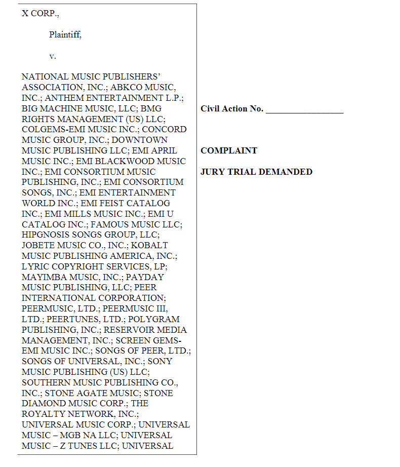 最近,埃隆·马斯克旗下的X Corp(原Twitter)已对18家音乐版权商和NMPA(美国国家音乐版权商协会)提起反垄断诉讼,指控其合谋迫使该社交媒体平台接受“超竞争价格”的行业统一许可协议。
