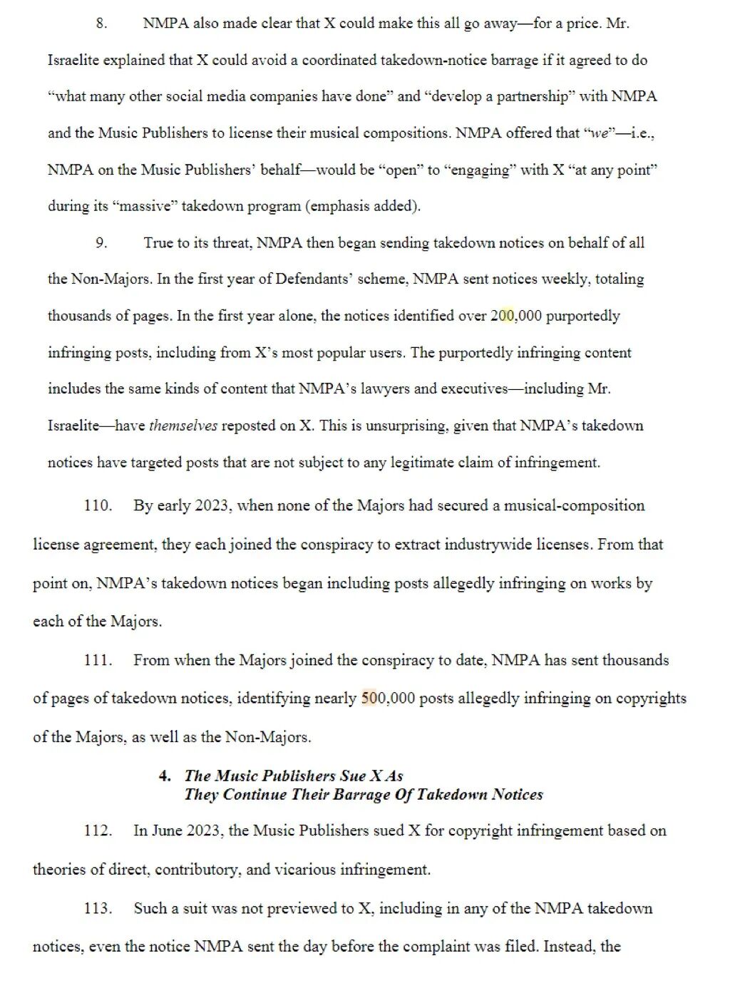 2021年10月,NMPA总裁David Israelite就曾代表所有音乐版权商向X发送了一封邮件。根据诉状描述,邮件中明确警告:NMPA即将启动一项“史无前例规模”的DMCA下架计划,将以空前的强度向X提交侵权通知。更耐人寻味的是,邮件中的表述——“这一切都可以消失,只要付出代价。”