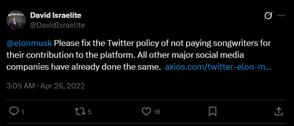 X在诉状中还引用了Israelite于2022年4月公开向马斯克发出的一条推文,当时正值马斯克收购Twitter的消息曝光:“@elonmusk请修复Twitter长期不向词曲作者付费的政策。所有其他主要社交媒体公司都已经这样做了。”
