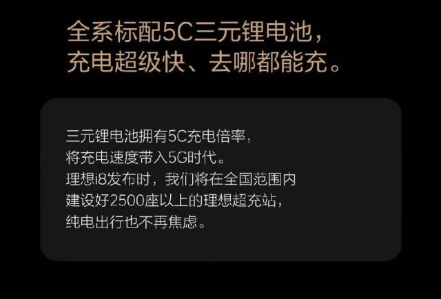 全系标配双电机智能四驱,前后电机最大功率分别为150kW和250kW,加上自研碳化硅电控,兼具高效和好开。全系标配5C三元锂电池,充电快,或达到15分钟充一半电的体验。官方表示,目前理想5C超充站上线了2000座,7月之前会突破2500座。