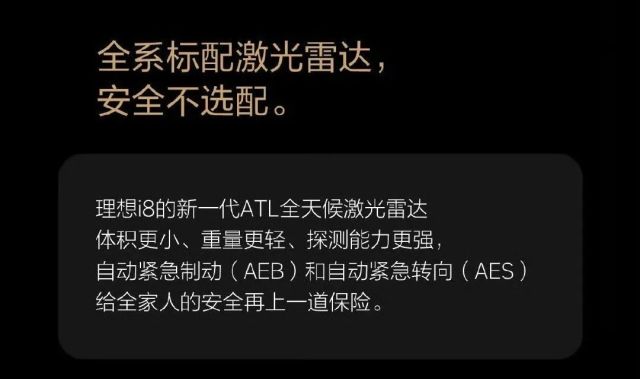 三排大六座布局,面向家用,预计空间优于L8,并打造“移动客厅”的舒适。还全系标配激光雷达,新一代ATL全天候激光雷达更小更轻,探测能力起飞,自动刹车+紧急转向这些保命功能全都有,安全性能直接拉满。