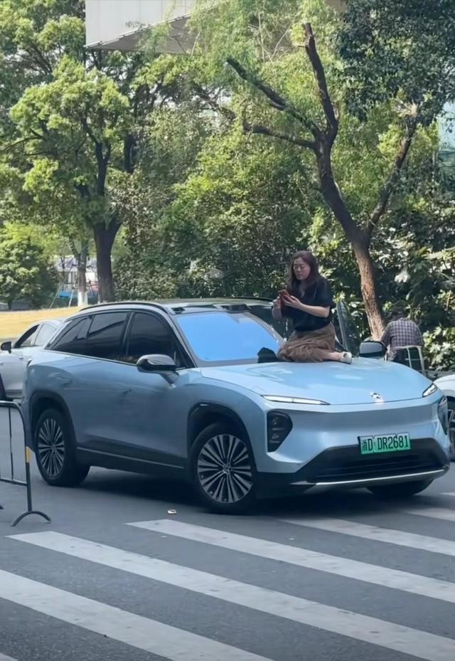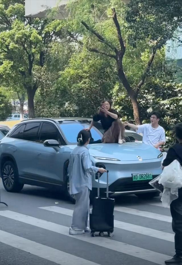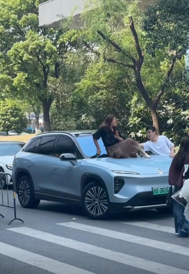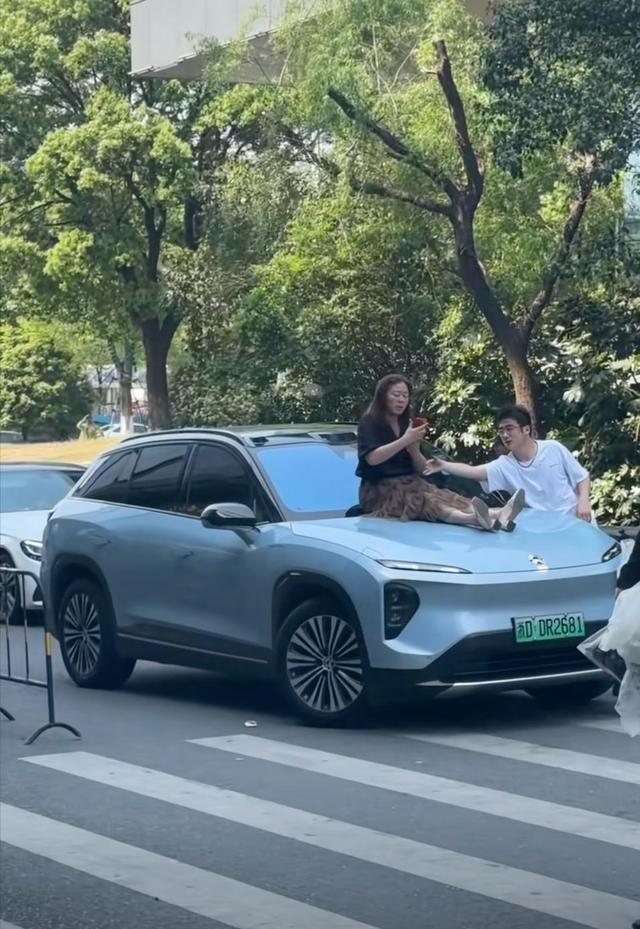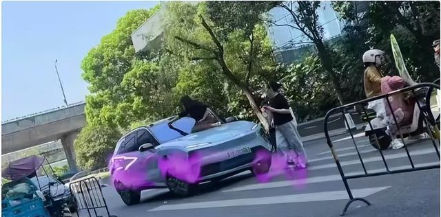 近日,在浙江绍兴的街道上,一辆车的引擎盖上坐着一位穿黑色短袖的中年妇女。