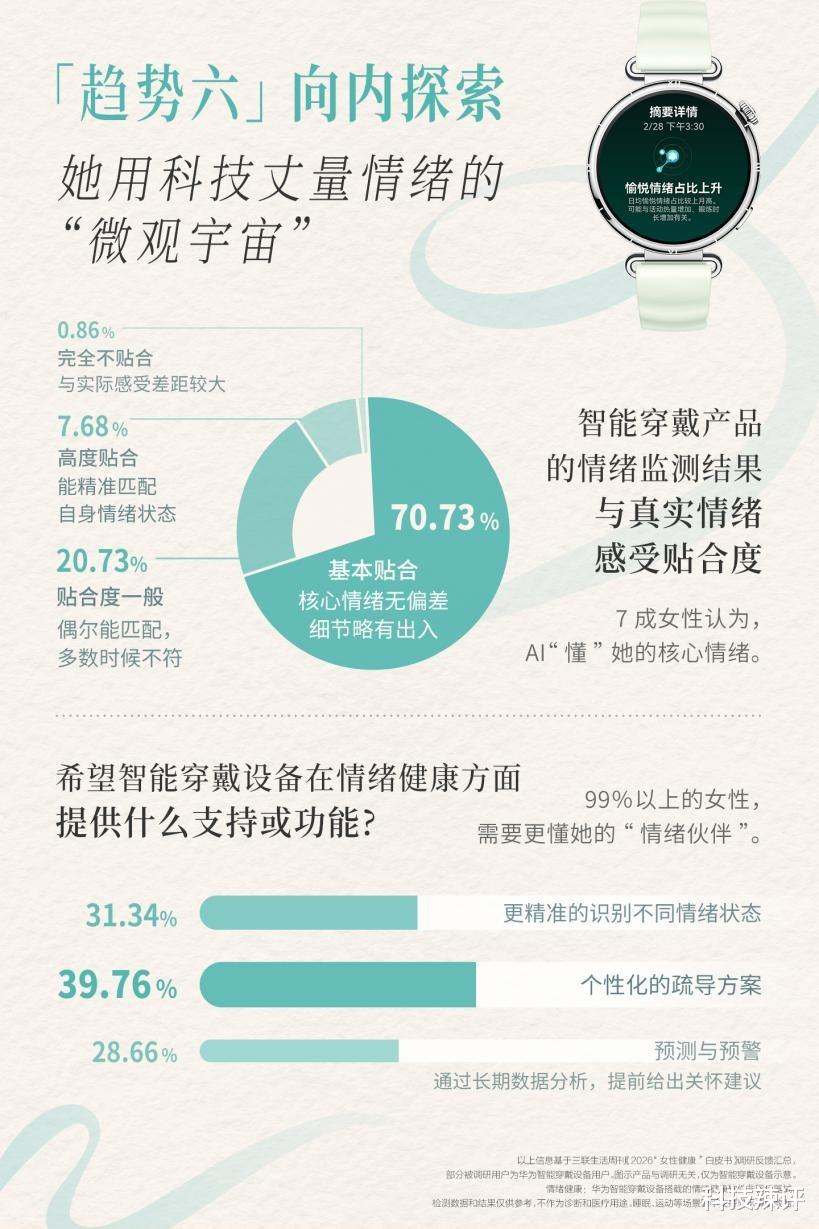 在心理健康方面,其情绪健康助手从基础的三分类升级至12种精细情绪状态识别,能更敏锐地捕捉用户的喜怒哀愁,堪称“腕上读心术”,更懂你的心。华为WATCH GT 6系列与三联生活周刊共同发布的《2026 女性健康白皮书》显示,将近四成的女性希望智能穿戴设备在情绪健康方面提供个性化的疏导方案。在这方面,华为WATCH GT 6系列处于领先地位。