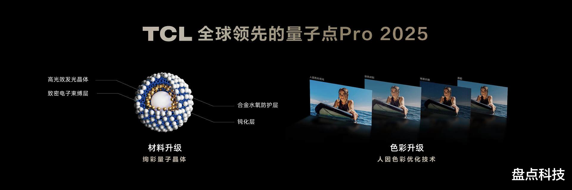 在材料方面,量子点Pro 2025进行了全面升级。由四元量子晶体升级为绚彩量子晶体,使用复合纳米金刚结构,并采用多层共挤技术和高精密混合技术制成量子点层,大幅提升发光效率。同时,TCL采用人因色彩优化技术,通过智能识别画面色彩,根据画面不同颜色采用动态色彩管理,进行多维渲染,让量子点的色彩显示更符合人眼对世界的感知。