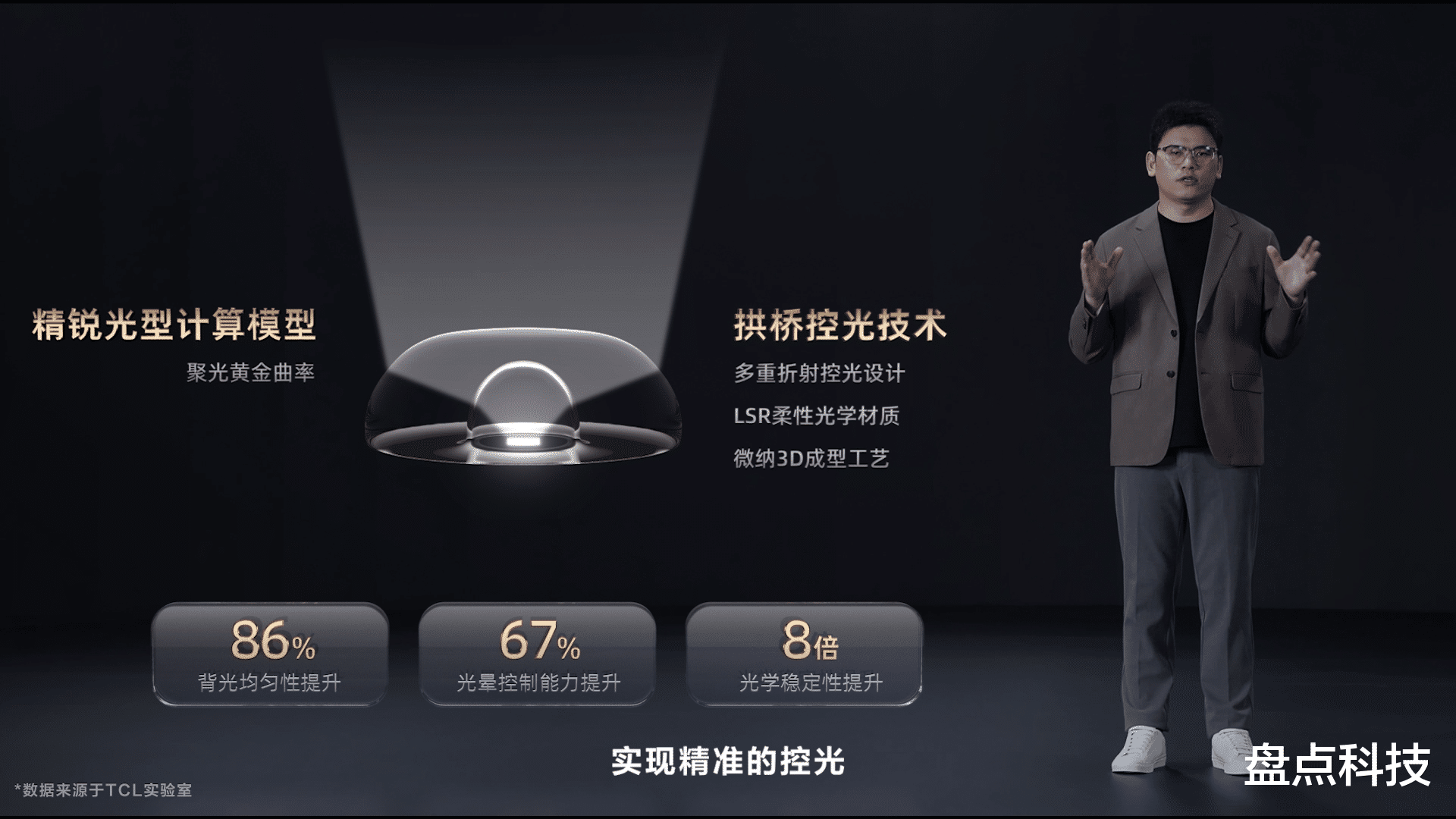 发光芯片的升级,是造就万象分区的第一个环节。TCL将蓝宝石高光晶底升级为超能高光晶底,并以ALD原子级耐蚀工艺实现电视亮度与能效的大幅提升,相较上一代多芯Mini LED芯片亮度提升53.8%,能效提升10%。第二,TCL使用升级版的拱桥控光技术,并采用可靠性更强的LSR柔性光学材质,同时还通过独家精锐光型计算模型,使新一代聚光微透镜在同样的分区数下,带来86%的背光均匀性提升与67%的光晕控制能力提升,更好地塑光型、去光晕,实现精准控光。