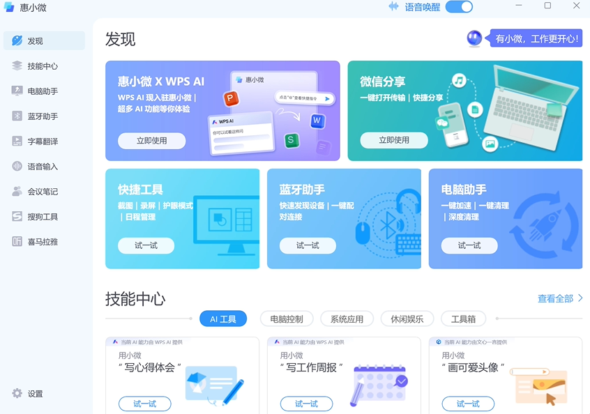 就惠小微本身嘛,算是个集成了效率助手、智能会议、电脑管家和生活助理等一系列AI相关功能的智能电脑助手,主打一个要啥有啥,甚至还有应用商店帮你找到适合自己的AI工具。