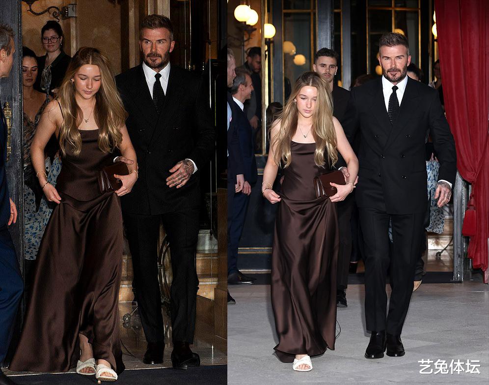 13岁女儿哈珀一袭棕缎礼服惊艳亮相,被外媒盛赞"行走的迷你版贝嫂",父女牵手离场的温馨画面引发粉丝尖叫。