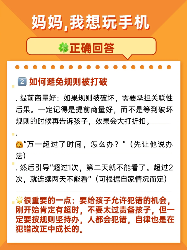 如果孩子打破了规则,我们应该提前讨论好相应的后果。比如,如果超过了一次约定的时间,第二天就不能玩手机;如果超过了两次,就连续两天不能玩。同时,我们要给孩子改正的机会,因为自律是在犯错和改正中逐渐培养起来的。