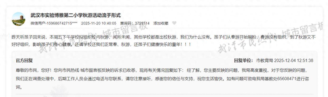 目前,武汉市教育局尚未就此事做出正面的回复,但该留言却如同一颗巨石投入平静的湖面,激起层层波澜在各大家长群、朋友圈悄然疯传。对于那所学校为何会组织如此奇葩的秋游,大家七嘴八舌讨论起来。