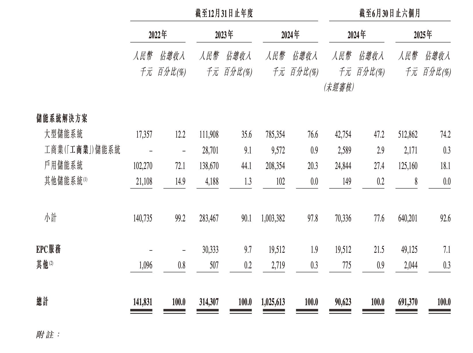 招股书显示,2022-2024年及今年上半年(下称:报告期),果下科技智能储能系统解决方案收入分别约1.41亿、2.83亿、10.03亿、6.40亿元,占总收入的比例分别为99.2%、90.1%、97.8%、92.6%;EPC服务收入分别约0、3033.3万、1951.2万、4912.5万元,占总收入的比例分别为0、9.7%、1.9%、7.1%;其他收入分别约109.6万、50.7万、271.9万、204.4万元,占总收入的比例分别为0.8%、0.2%、0.3%、0.3%。