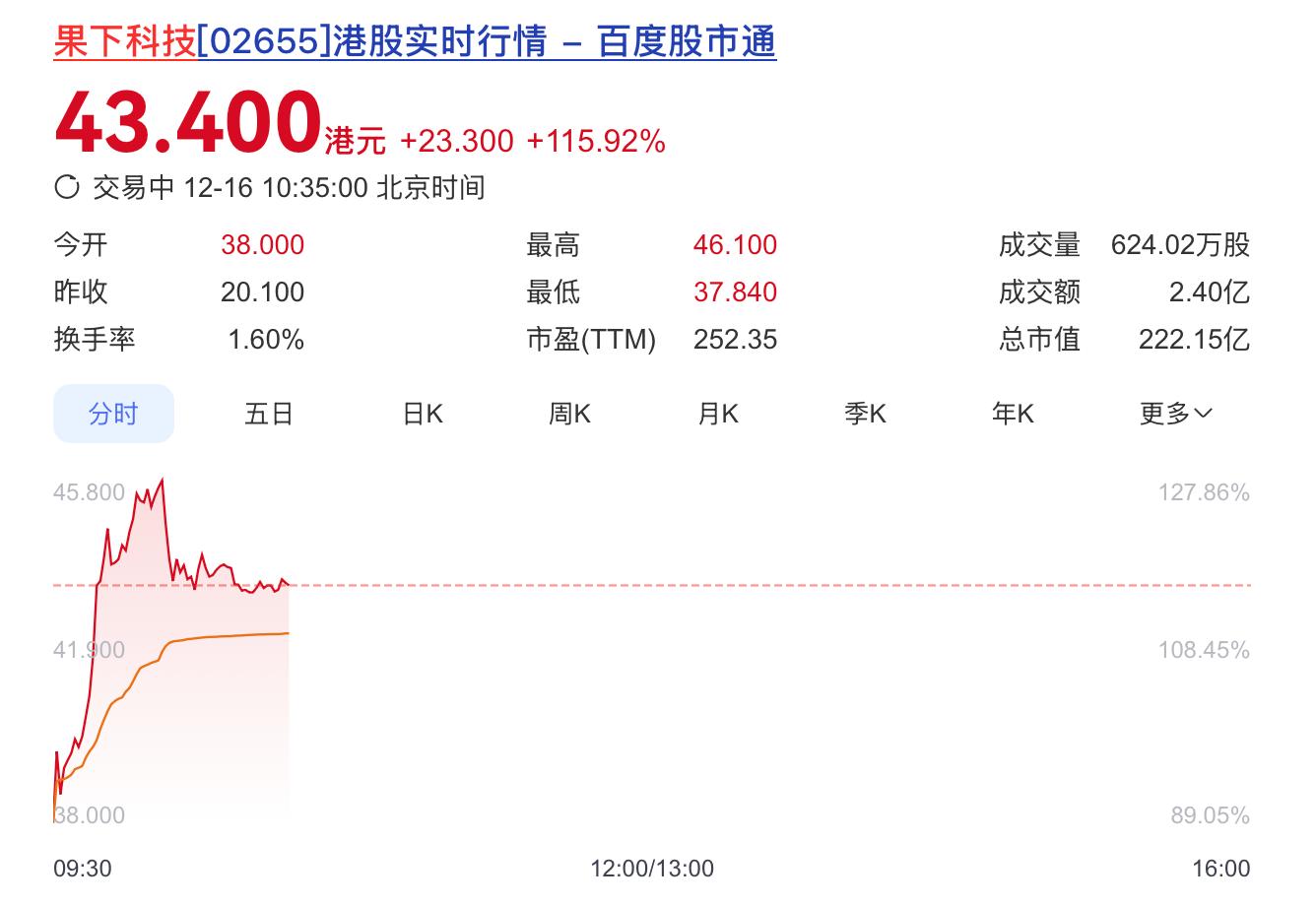 12月16日,储能系统集成商果下科技股份有限公司(下称:果下科技)正式在港交所主板挂牌上市,发行价为20.10港元/股。今日开盘,果下科技大涨89.05%报38.00港元/股。截至发稿,果下科技涨115.92%报43.40港元/股,总市值222.15亿港元。