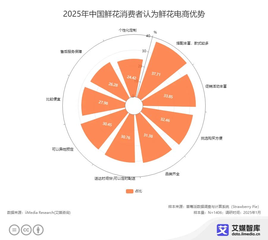 iiMedia Research(艾媒咨询)数据显示,在2025年中国鲜花消费者认为鲜花电商优势中,37.71%消费者会选择搭配丰富,款式较多,33.85%消费者会选择促销活动丰富,32.46%消费者会选择挑选购买方便,31.38%消费者会选择品类齐全,30.76%消费者会选择送达时间快\可以定时配送。