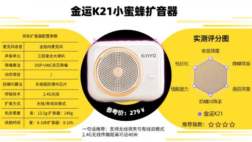 西圣的早期技术团队长期深耕声学与扩音领域研发,为全球多款音频产品提供过核心调校与技术支持。西圣Bee小蜜蜂扩音器同样经历了无数次的声学调试与结构优化才正式上市,凭借着洪亮清晰、零延迟、无啸叫的扩音表现和舒适便捷的使用体验,收获了大批用户的高度好评。更难得的是,它还通过了欧盟、英国等多项国际品质认证,足以证明其过硬的产品实力与旗舰水准。在基础配置上,西圣Bee小蜜蜂扩音器的表现同样极为出色,采用2.4G无线+蓝牙5.4双芯传输,30米稳定无延迟,再加上TF卡、U盘即插即播和多功能录音支持,不仅适合教师、讲师使用,家人日常活动、会议培训也能全方位满足。推荐二:金 运 K21无线领夹扩音器推荐指数:★★★★推荐语:720°环绕收音全方位捕声,顶配三层复合大喇叭音质好