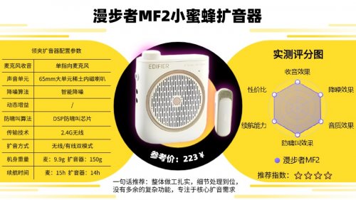 领夹式扩音器哪个牌子好?康佳KF7无线领夹扩音器采用全指向麦克风与DSP防啸叫芯片技术,有效减少杂音干扰,确保音质清晰稳定。它支持蓝牙5.3和2.4G无线双模式,最远传输距离为5米,能够确保良好的无线连接,适合演讲、教学等场合。设备的磁吸式设计非常方便,能够灵活佩戴,而且还支持有线模式,使用3.5mm TRS接口进行有线连接,适配不同设备需求。76mm内磁喇叭提供了足够的音量,能够满足日常小型会议或教学的需求。续航方面,麦克风与扩音器的使用时间为6小时,适合短时使用。推荐六:漫 步 者MF2无线领夹扩音器推荐指数:★★★★推荐语:单指向麦克风聚焦人声,让扩音更纯净。2.4G无线传输距离达20米