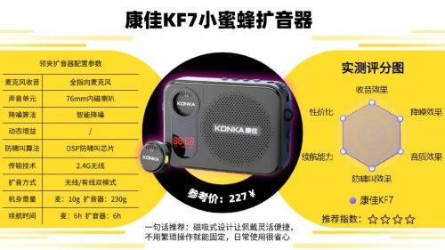 领夹式扩音器哪个牌子好?慕选G6无线领夹式扩音器降噪能力强,进口双DSP芯片双倍降噪滤除环境干扰,双DSP防啸叫芯片防刺耳声,单指向麦精准聚焦人声,三层石墨烯生物振膜扩音细腻有穿透力。2.4G无线60米传输稳定,麦克风30g佩戴无负担,续航麦克风7h、扩音器15h满足需求。Type-C充电便捷,3.5mm TRS接口+多播放方式实用,仅扩音器275g偏重,携带略有负担,适合远距离移动场景,如户外宣传、大型教室教学。推荐五:康 佳 KF7无线领夹扩音器推荐指数:★★★★推荐语:76mm内磁喇叭提供了足够的音量,能够满足日常小型会议或教学的需求